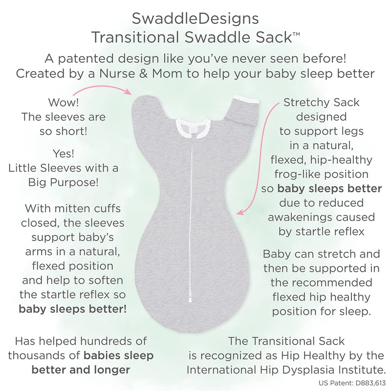 The Transitional Swaddle Sack is designed to bridge the gap from swaddling to sleeping sack. When baby is ready to transition from a swaddle, but not ready for a sleeveless wearable blanket. The Transitional Swaddle Sack is perfect for babies who prefer to sleep with arms up. The Swaddle Sack supports baby in a back sleeping position and allows for multiple arm and hand positions to help baby sleep better. The Transitional Swaddle Sack with partial suppression of the Moro (startle) reflex, and the arms up sleeve design is a safer sleep solution. If baby rolls over, the design allows baby to use their arms to lift their torso and reposition his or her head to get access to air. The Swaddle Sack uniquely shaped arms up 3/4 Length sleeves are not full length, so baby's arms will be close to body when mitten cuffs are closed for swaddle snugness. The patent pending sleeve design are not full length "by design." When the mitten cuffs are closed and baby is placed in the Swaddle Sack, the uniquely shaped arms up design positions baby's in a flexed, close-to-body, arms-up position, and shape and length of the sleeve helps partially suppress the startle reflex. Parents are encouraged to close the cuffs first, and then place baby in the sack. If the caregiver wants to allow baby to suck directly on hands, then open one or both of the mitten cuffs. The 2-way zipper makes the Swaddle Sack easy to use for the caregiver. The zipper has two zipper pulls - one at the neckline and one at the foot of the sack. Winner of multiple awards. Recognized by the International Hip Dysplasia Institute. The lower section is less spacious than a typical sleeping sack, and in turn, the Swaddle Sack provides some suppression of the startle reflex for the legs. The hip healthy design allows baby's knees and hips to flex. Made from premium, interlock cotton knit. Machine washable. Swaddle Sack is a registered trademark of SwaddleDesigns. Patent pending.