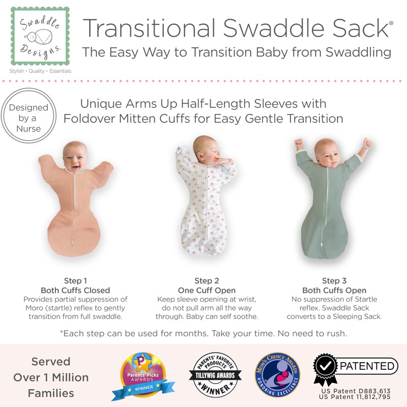 - The TRANSITIONAL SWADDLE SACK allows baby to SELF-SOOTHE and promotes BETTER SLEEP and SAFER SLEEP; Perfect for babies who prefer to sleep with ARMS UP, babies who are starting to rollover, and babies able to break out of a traditional swaddle