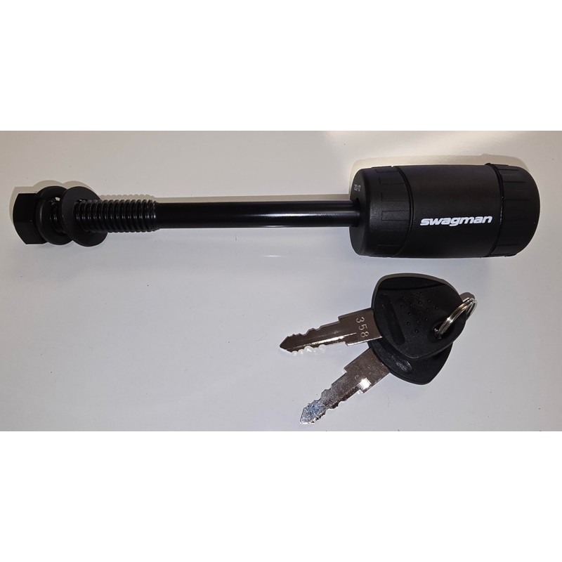 Threaded 1/2" Class 2 Locking Hitch pin for use with Swagman 1-1/4" and 2" universal racks; tubular high security key allows for easy access with only a half turn to unlock, triple chrome plated.