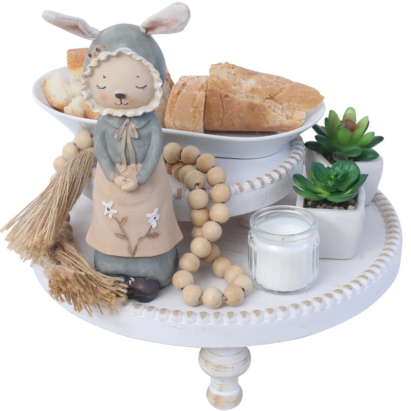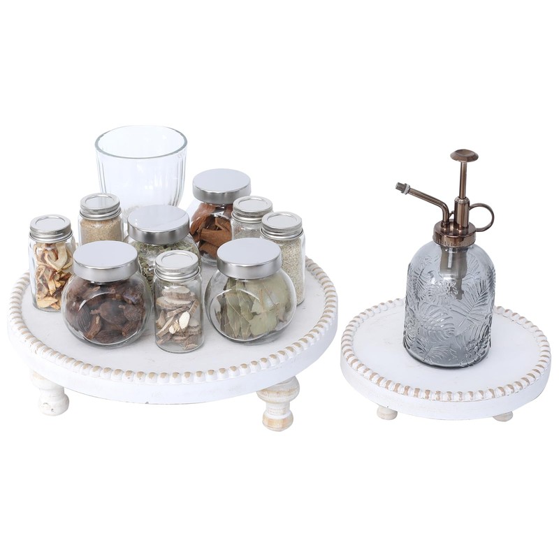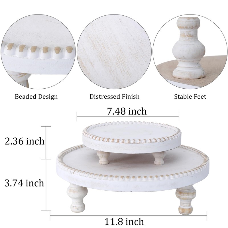 SwallowLiving Rustic Set of 2 White Round Wood Tray Riser Farmhouse Pedestal Stand with Beaded Edge for Decor Whitewash Finish Wooden Cupcake Display for Cakes and Decorative Items 11.8/7.5 inches