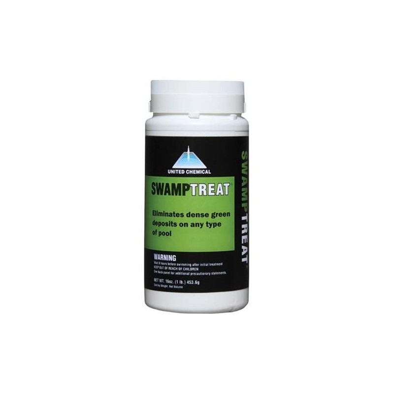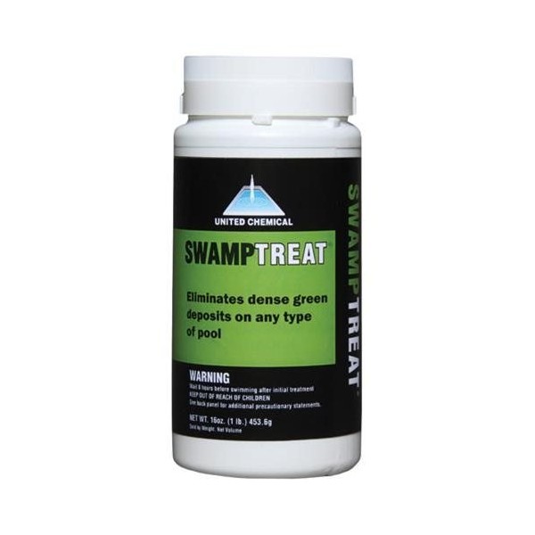 Swamp Treat will eliminate algae in any type of pool in 24 hours or less! Swamp Treat is the most powerful formula on the market, guaranteed to clean the worst algae blooms, fast! Your pool will go from a green swamp to blue in as little as a few hours. As the filtration system kicks in, Swamp Treat accelerates your chlorine's ability to fight algae blooms and the pool will clear. A 1 lb. bottle will treat 20,000 gallons, and do in one treatment what other products take multiple times to do - and do it faster. The non-toxic formula does not contain any metals, will not stain your pool or affect water balance. NOTE: Be sure to pre-dissolve the chlorine and broadcast the solution on top of the pool, don't pour it down the sides.