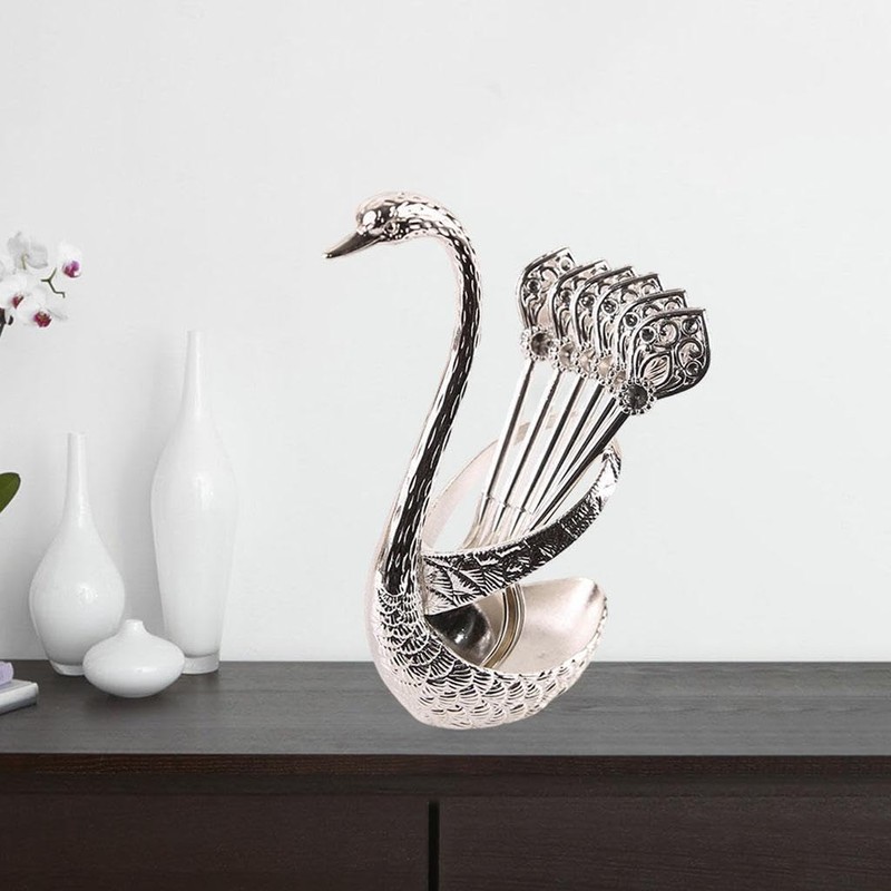Swan Base Holder with 6pcs Elegant Ice Cream Spoons Teaspoons Coffee Dessert Sugar, Silver
