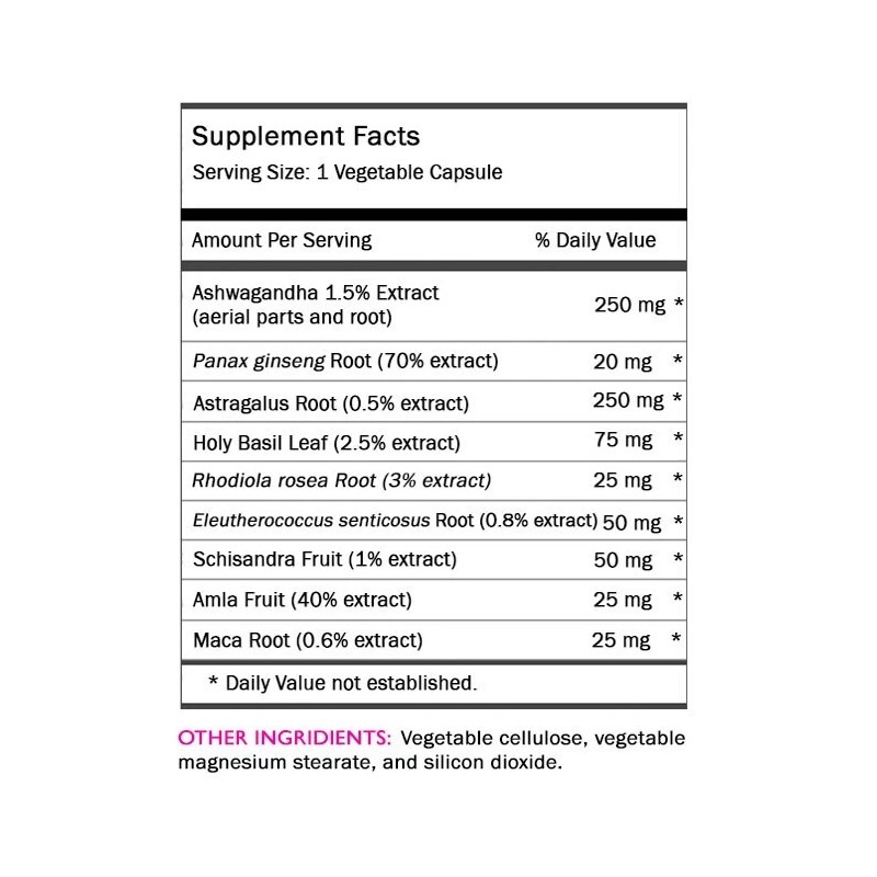 - Ingredients: Ashwagandha, Panax ginseng Root, Astragalus Root, Holy Basil Leaf, Maca Root