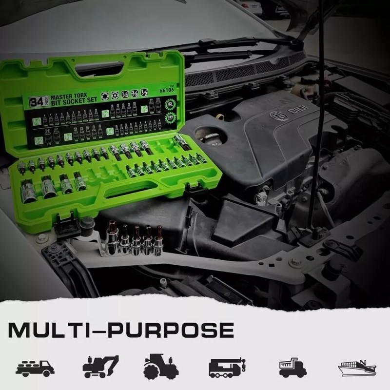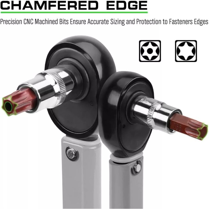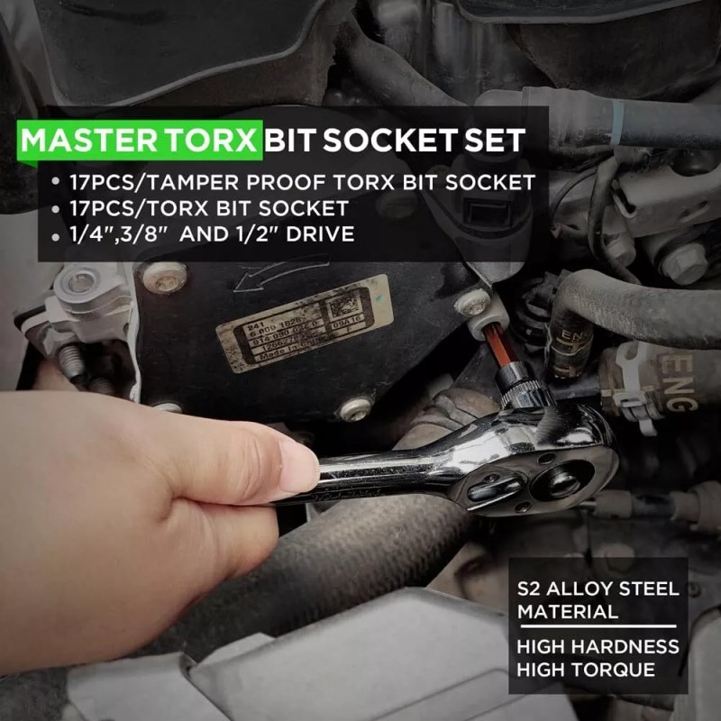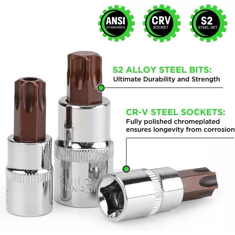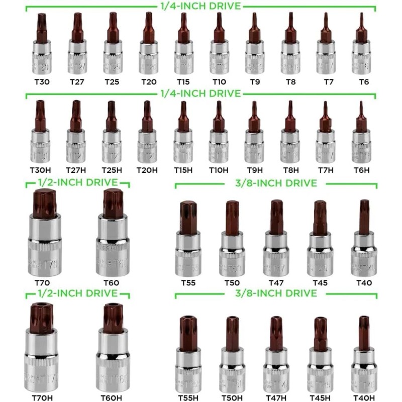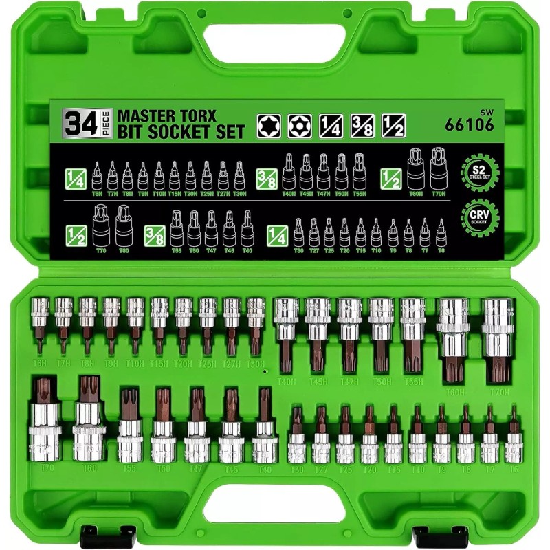 - 34-Piece torx socket set are made of S2 alloy Steel and chrome vanadium steel(CR-V) for maximum strength and longevity.