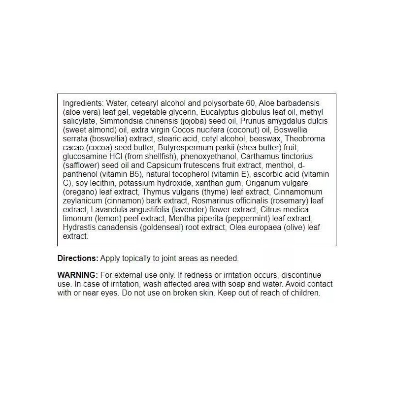 • Combines glucosamine HCl, boswellia extract, Capsaicin and more