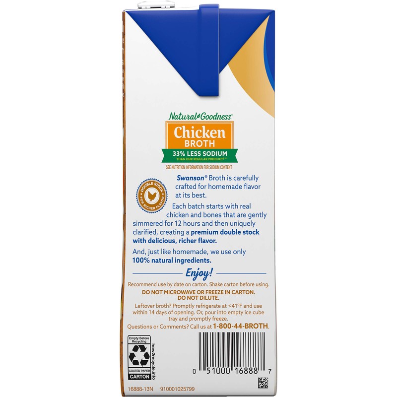 - 100% NATURAL CHICKEN BROTH: No MSG added*, preservatives or artificial flavors added, gluten free, and made with 33% less sodium than our regular Chicken Broth** [*Small amount of glutamate occurs naturally in yeast extract **This product contains 570mg of sodium per serving versus 860mg of sodium per serving in regular Swanson chicken broth]