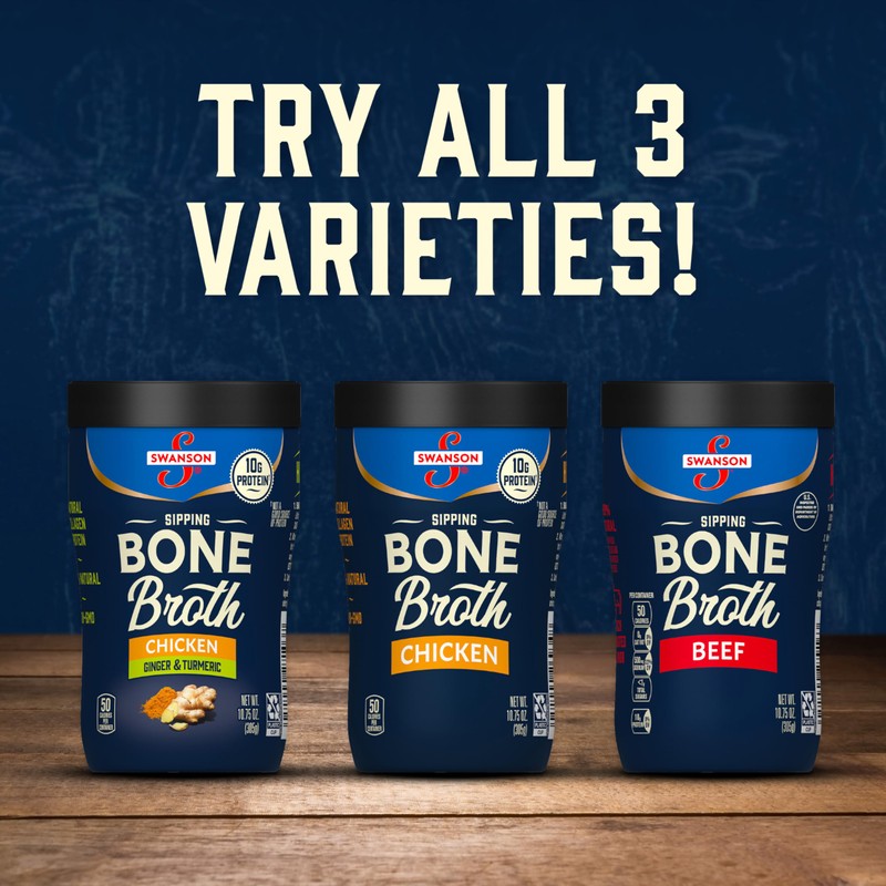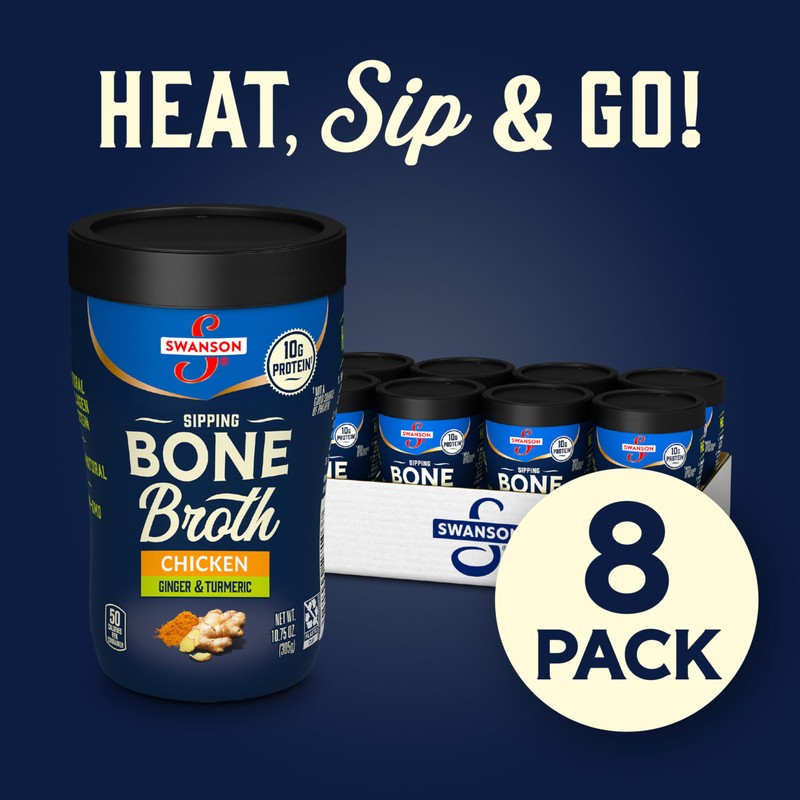 Swanson Sipping Chicken Bone Broth with Ginger & Turmeric is the nutritious snack that's warm and savory, with naturally occurring collagen protein. Made from chicken bones, vegetables, herbs and spices, this sipping broth can fit into many different diets. Packaged in a microwavable, sipping cup, our rich bone broth is a simple, flavorful way to add collagen protein to your on-the-go lifestyle. Just heat it up in the microwave fast for a nutritious and 45 calorie on the go snack. Swanson Bone Broth with naturally occurring collagen protein is made from simple, high-quality ingredients you can recognize. Our chicken is sourced from farms we trust and we select the finest vegetables, picked at the peak of freshness. We start with real chicken bones, then we cook our broths to perfection to deliver a unique balance of flavor.