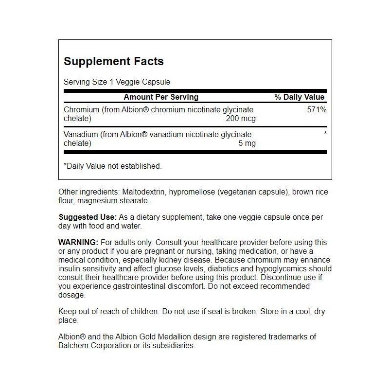 Product descriptionIntroducing a alternative for helping to maintain a healthy body. We've combined clinically-relevant dosages of advanced Albion glycinate chelated vanadium and chromium for unsurpassed dietary support. Albion minerals are known worldwide for providing superior absorption, setting the gold standard for supplemental minerals.Manufacturer Contact InformationCustomer Service Phone: 1-866-893-1746
