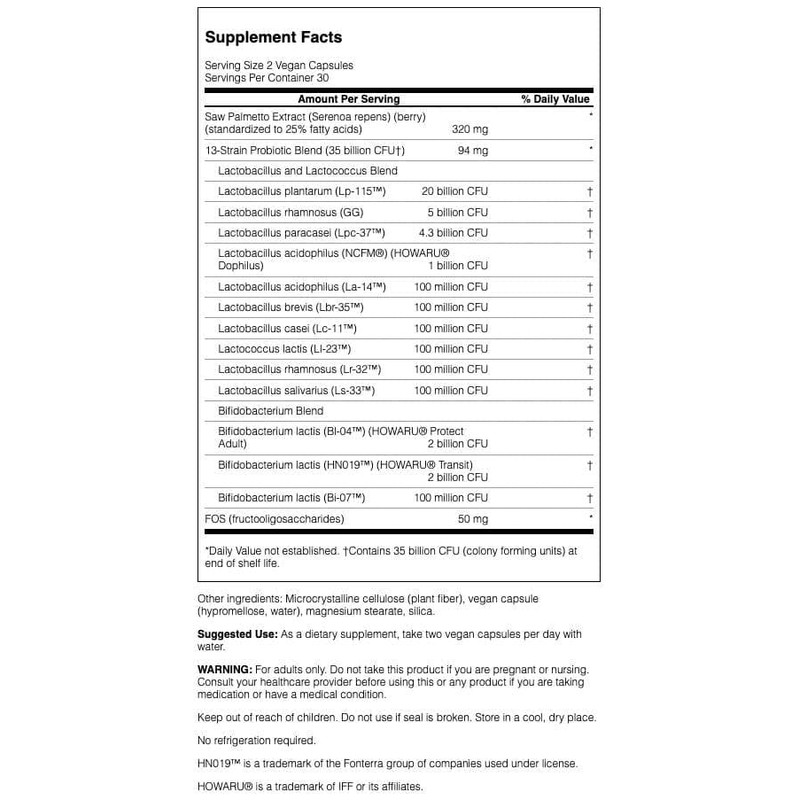 - Functional standardized saw palmetto plus prebiotic FOS combined with 35 billion CFU per serving from 13 targeted, shelf-stable probiotic strains, including doctor-trusted* L. acidophilus NCFM