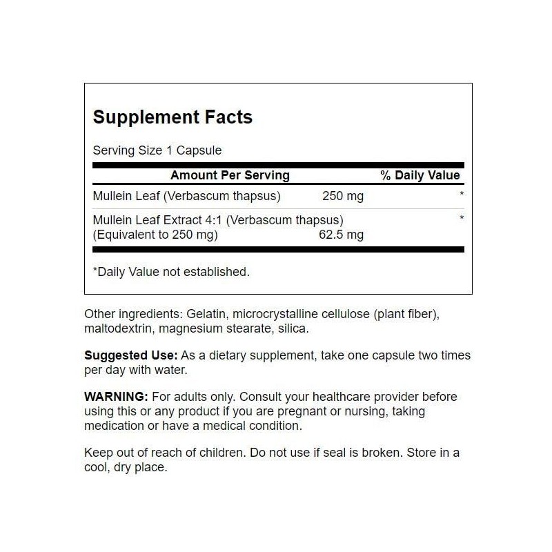 Product descriptionSwanson Mullein Leaf Extract capsules contain a standardized 4:1 extract of pure mullein leaf. Dioscorides, the ancient Greek pharmacologist who wrote the original Materia Medica, is believed to be the first to employ this herb traditionally used for respiratory support. This remains its primary use today, and herbalists from China to California still recommend it just as Dioscorides did over 2,000 years ago.Manufacturer Contact InformationCustomer Service Phone: 1-866-893-1746