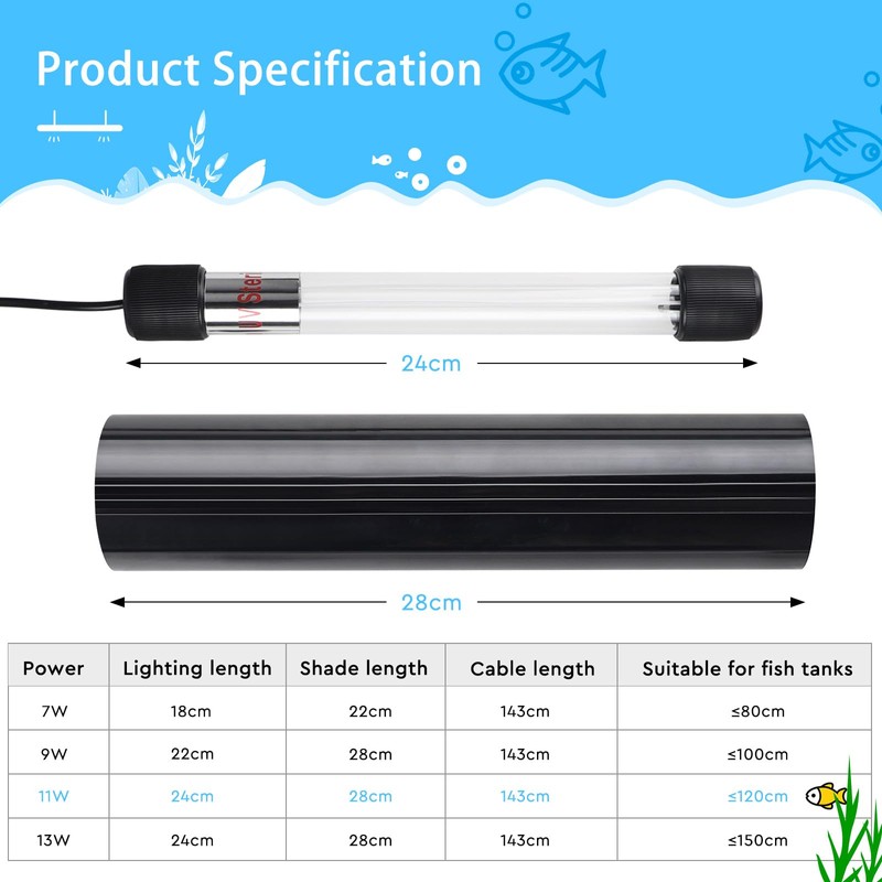 - Safety design: the lamp tube is equipped with thickened protective covers at both ends to increase water resistance. We also offer a lampshade to reduce UV damage to the eyes and fish and ensure safer use.