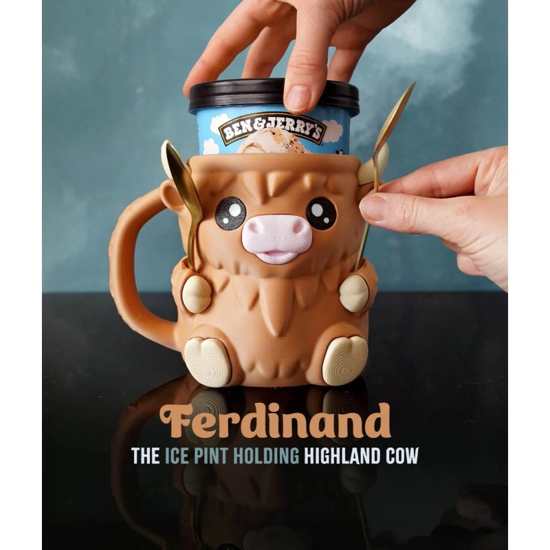 Ferdinand the Highland Cow is here to make your dessert time extra sweet! Adorably designed and full of surprises, this 3D printed pint holder keeps your ice cream cold, your hands cozy — and your snacks hidden just where you need them. 😉
