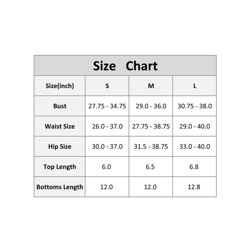 L---Bust:31.5-38.0 inch, Waist Size:30.0-40.0 inch, Top Length:6.75 inch, Bottoms Length:12.0 inch