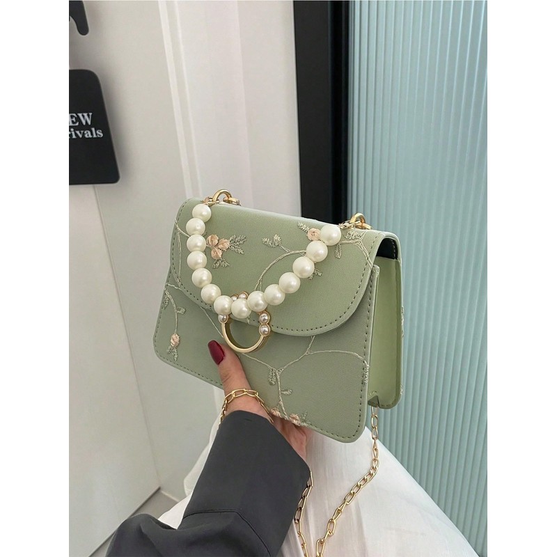- Features: Floral embroidery, faux pearl decor, double handle strap, removable chain, magnet closure, square bag, mini crossbody bag for women