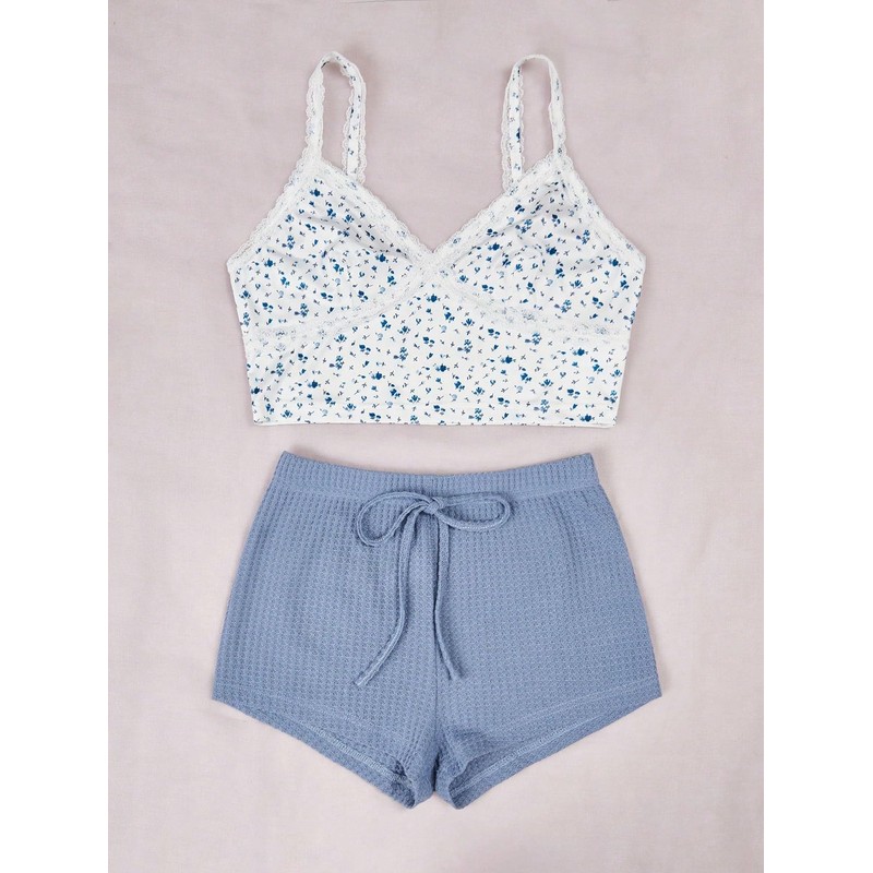 - Features: Shorts, cami, spaghetti strap, pajama set, ditsy floral, lace trim, drawstring pajams shorts, pj set, loungewear, sleepwear