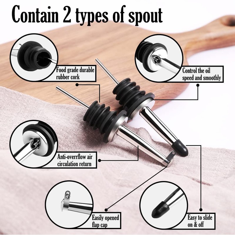 - Dos boquillas de vertido controladas de 18, 8 boquillas de acero inoxidable con tapa sellada o tapa de solapa, se ajustan bien a la botella y mantienen el polvo fuera. El líquido de vertido es suave sin pegarse y puede dispensar fácilmente la cantidad adecuada de aceite para una dieta saludable.
