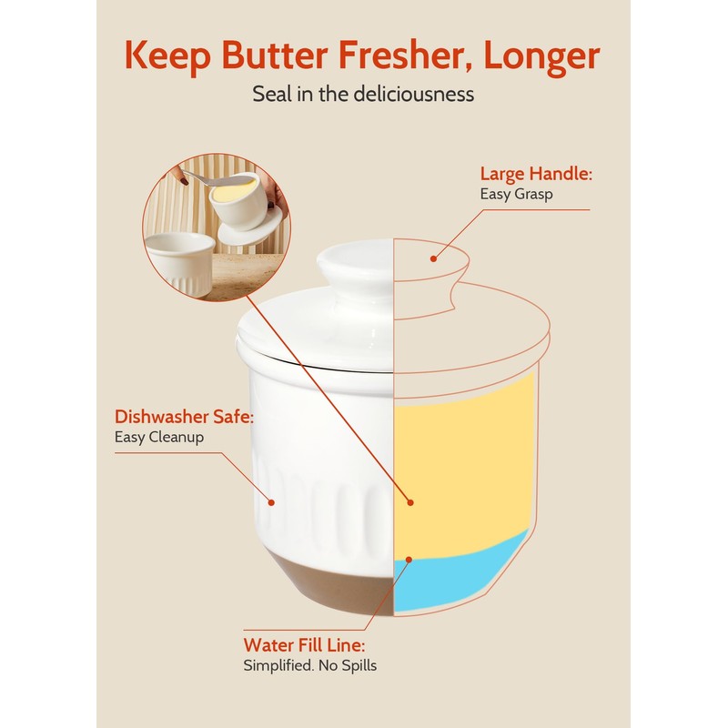 - EASY TO USE - Just press the butter hard to avoid air bubbles and get spreadable bliss when filling the butter crock with butter. Add water to the butter dish to form an airtight seal and prevent spoilage.