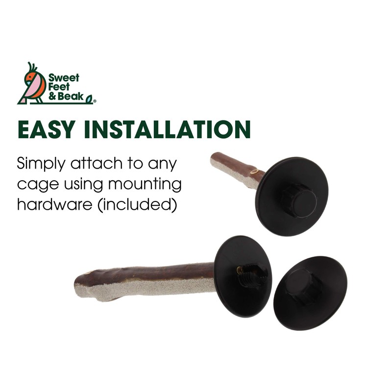 - SUPER EASY INSTALLATION - hand made in the USA bird supplies with a durable plastic base, not heavy cement. Simply attach the bird perch stand to the bird cages. Perch safety cap oriented for a vertical cage can fit horizontal bars 5/8 of an inch or greater. Plastic mounting hardware is included. No sharp metal hardware will be left sticking out.