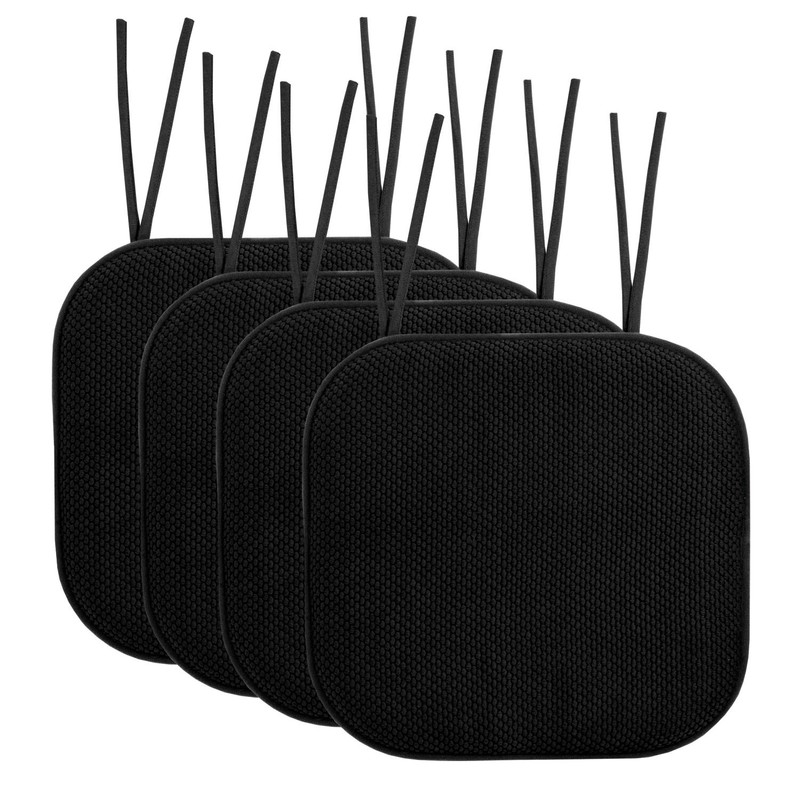 Sweet Home Collection Chair Cushion Memory Foam Pads with Ties Honeycomb Pattern Slip Non Skid Rubber Back Rounded Square 16" x 16" Seat Cover, 4 Pack, Black 4 Pack