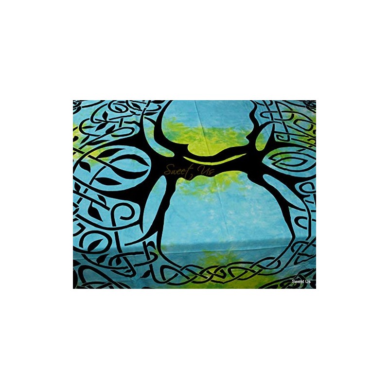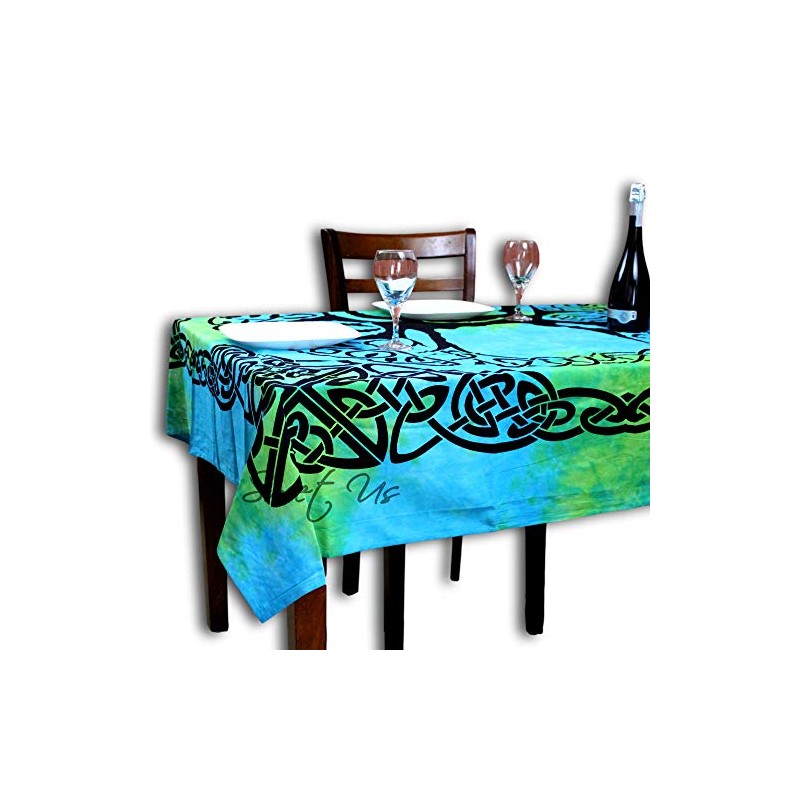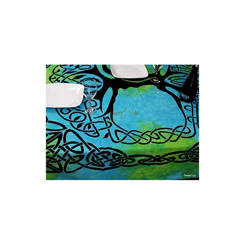 Sweet Us Celtic Print Tablecloth for Square Tables 72x72 Blue Green Turquoise Tree of Life Cotton Fabric Kitchen, Dining Linen