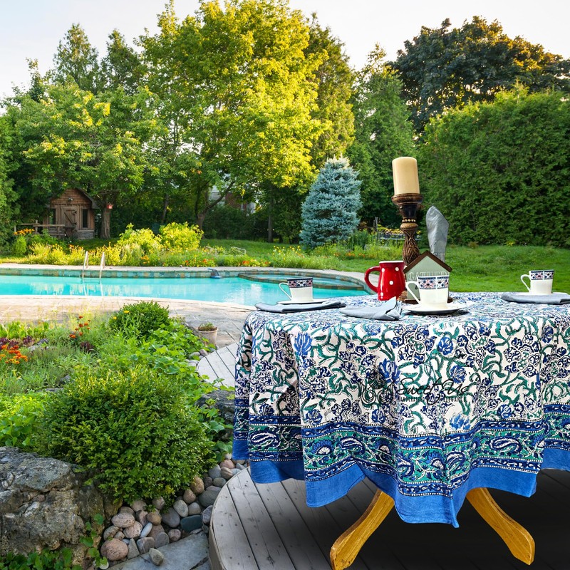 - Elevate Your Kitchen And Dining Experience With This Exquisitely Handcrafted Tablecloth And One Gray Napkin Experience The Beauty Of A Hand-Block Printed Floral Design In Shades Of Ocean Blue, And Mystic Teal On A Light Base. Our 100% Cotton Tablecloth Includes One Gray Napkin.