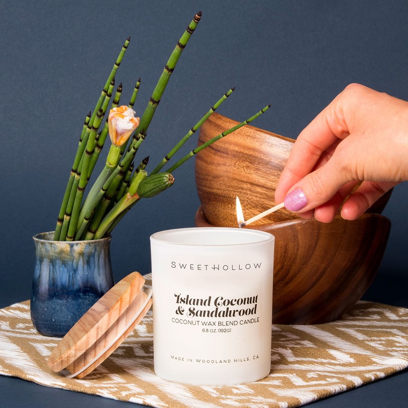 SweetHollow Coconut Sandalwood Candle in White Jar with Wood Lid, Highly Scented and Long Lasting Coconut Wax Luxury Candle for Home and Gifts, Tropical Fruit Scent, Beach Inspired, Large