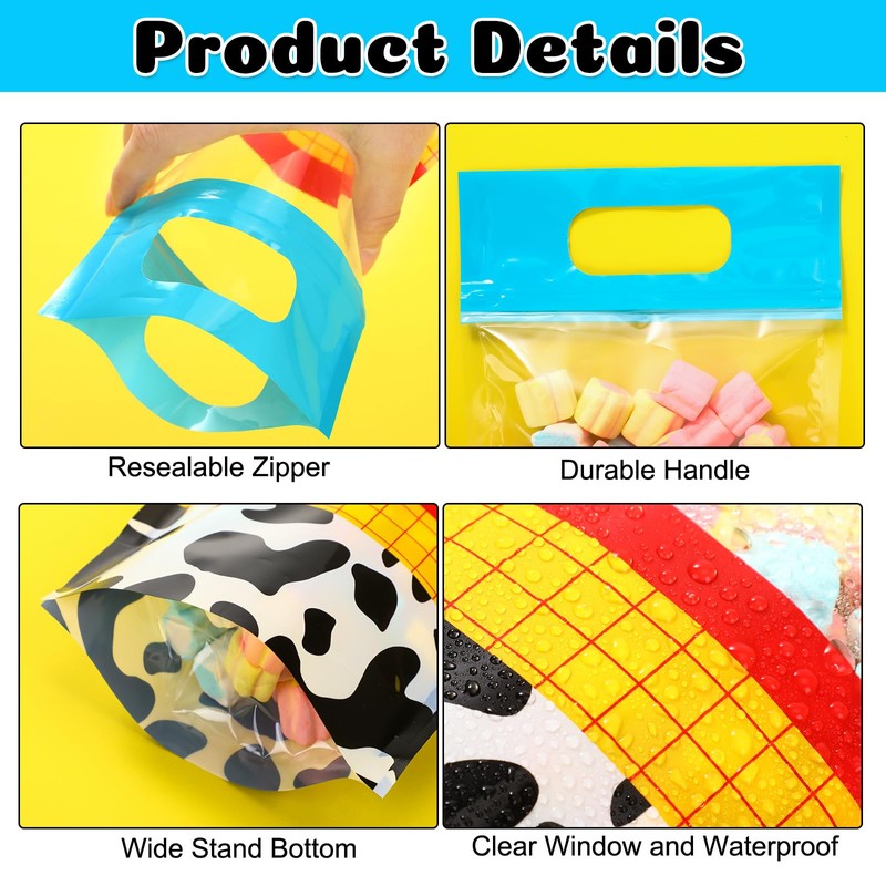 - Cartoon Theme Design: these cartoon treat gift bags are designed with cow pattern, yellow plaid, and a blue sky with white clouds, printed in double sides, bright color is full of western spirit and can create a strong party atmosphere, making the party more eye catching and vibrant