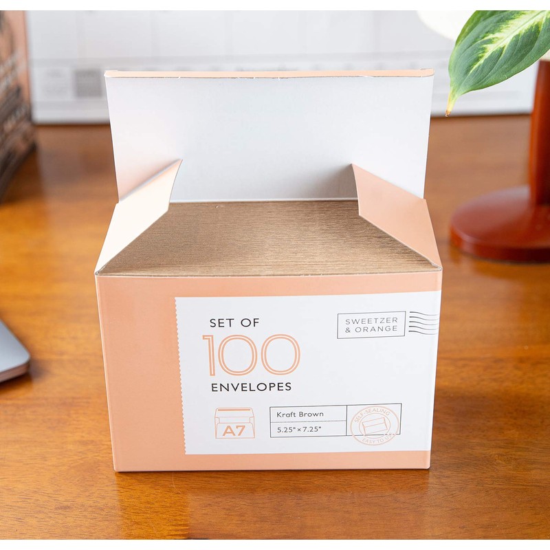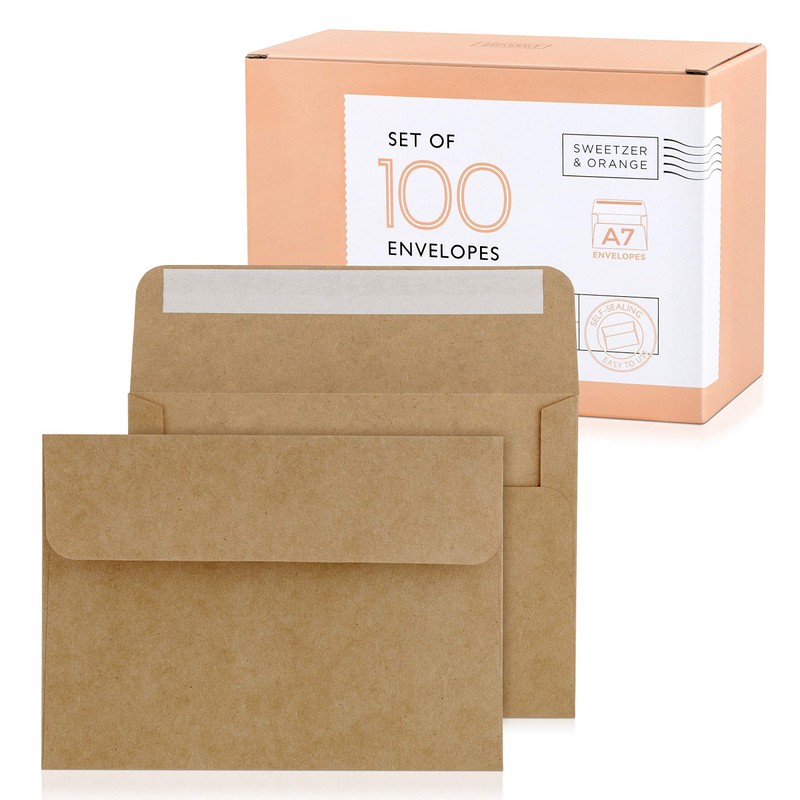 Sweetzer & Orange, Kraft Envelopes Self Seal. 100x Envelope with Box. Mailing Envelopes 5x7 (True 5.25 x 7.25 in.) Brown 150gsm Self Sealing Envelopes, Blank A7 Envelopes for Invitations and Wedding