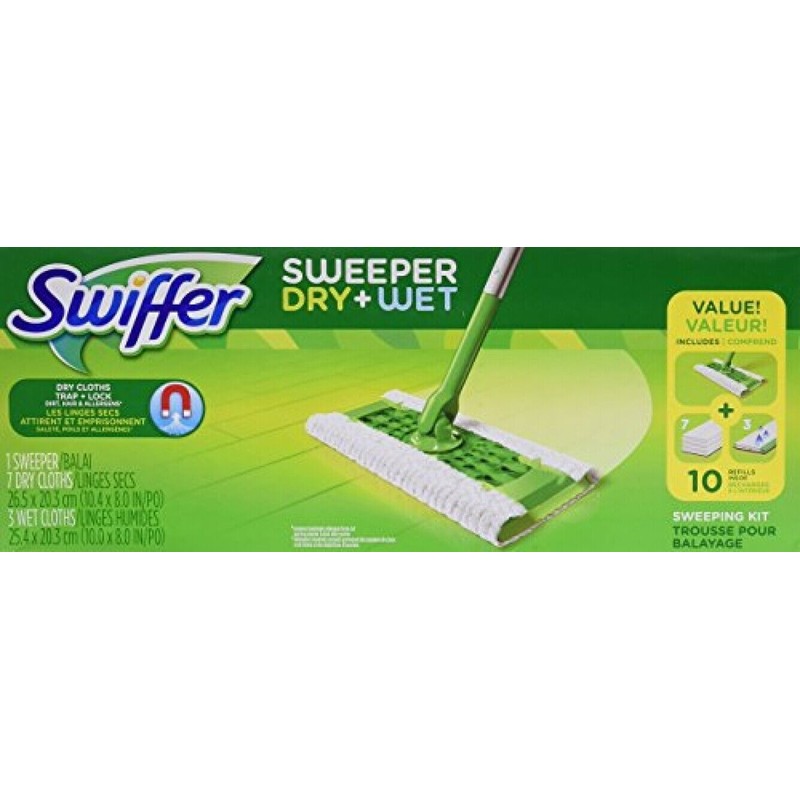 Swiffer Sweeper Floor Mop Starter Kit -- 6 per case. With a one two cleaning punch, Swiffer Sweeper is designed to sweep and mop your floors. Thick dry sweeping cloths conform to the surface of your floors and grout lines, trapping and locking dirt. Wet mopping cloths dissolve dirt and grime for good, trapping it in its core and locking it away. Do not use Swiffer Sweeper wet cloths on unfinished, oiled, or waxed wooden boards, non sealed tiles or carpeted floors. Some assembly required. Satisfaction Guaranteed or Your Money Back Via Prepaid Card. Visit http//www.swiffer.com/our commitment to clean/money back guarantee Dry cloths have 3X Cleaning Action on Dirt, Dust and Hair Textured wet mopping cloths dissolve dirt and grime and lock it away When you run out, save your Sweeper and buy more wet and dry cloth refills Starter kit includes 1 Sweeper, 7 dry sweeping cloths, 3 wet mopping cloths. Avoid Accidents Keep out of the reach of children and pets to avoid accidental ingestion. Swiffer Wet. In case of eye contact or prolonged exposure to skin, flush with water to reduce irritation. If irritation persists, call a physician. Avoid exerting excessive pressure on mop pole as breakage may occur. Do not use Swiffer Sweeper wet mopping cloths on unfinished, oiled or waxed wooden boards, non sealed tiles or carpeted floors because they may be water sensitive. Connect Poles, Attach Refill, Clean, Remove refill when dirty