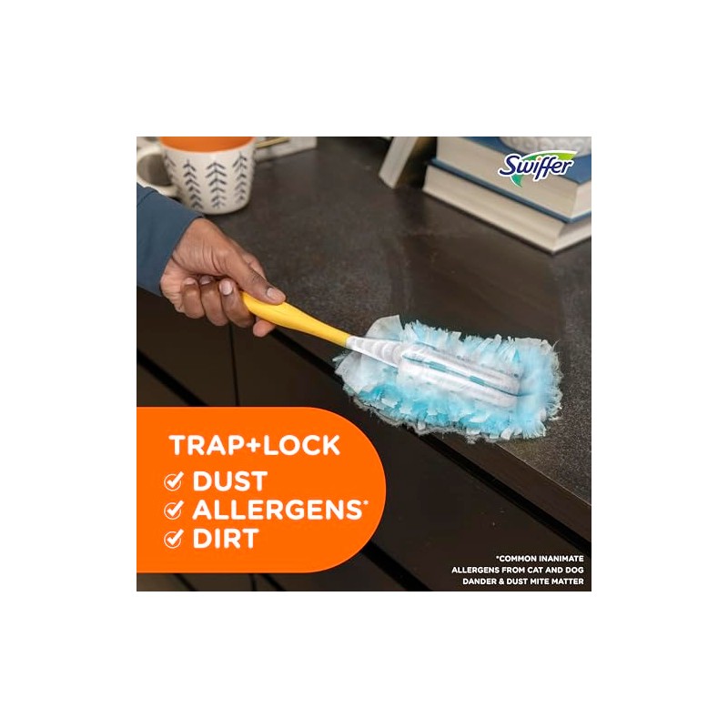Swiffer Dusters TRAP + LOCK dust & up to 95% of allergens*. Use Swiffer Dusters for cleaning wherever dust shows up, including fan blades, blinds, car interior, keyboard vents, bookcases, and more. They are made with specially coated fibers that grab onto dust & don't let go. *Common inanimate allergens from cat and dog dander & dust mite matter