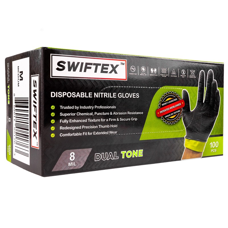 SWIFTEX Heavy Duty Nitrile Gloves, Dual Tone, Black Green, ZIG Textured, Secure Grip,Latex Free,Powder Free, 8mil, Box of 100 (Large)