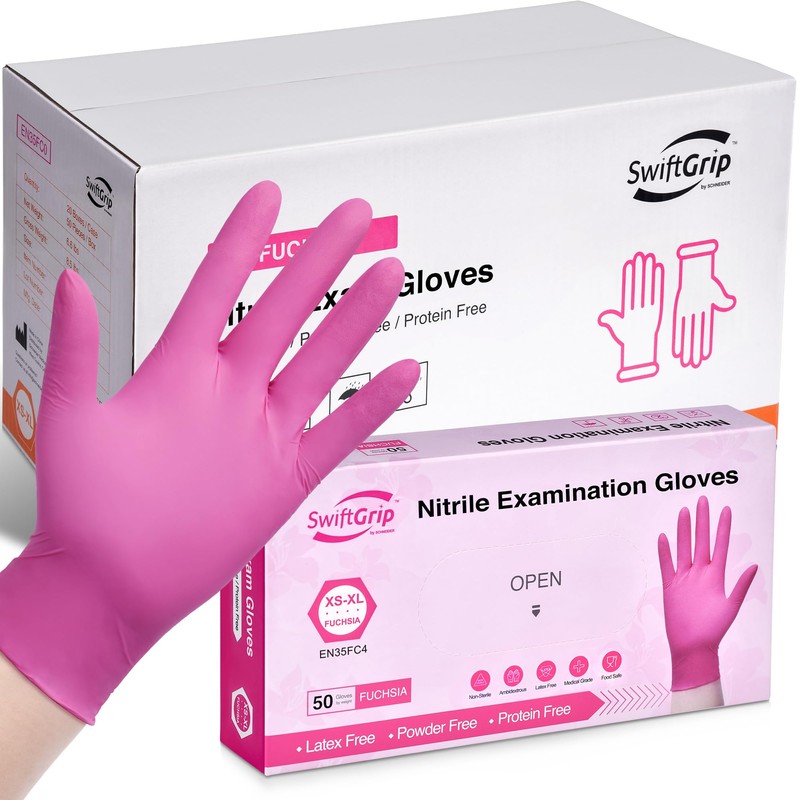 SwiftGrip presents a selection of lightweight vinyl, nitrile, and latex gloves, skillfully engineered to provide the perfect balance between performance and dexterity across a range of light-duty applications. Ideal for households, clinics, hospitals, senior care centers, child care facilities, food services, janitorial services, salons, labs, veterinary clinics, and shops, our gloves prioritize hygiene and hand protection. SwiftGrip is dedicated to offering comfortable, budget-friendly gloves that accommodate frequent glove changes to ensure maximum protection. Why Choose Nitrile Gloves? Nitrile gloves are made from a synthetic rubber called NBR (nitrile butadiene rubber), providing a latex-free option for users with latex allergies. These gloves offer higher chemical and puncture resistance compared to similar vinyl and latex gloves, delivering an enhanced barrier against grease, oil, paints, and other organic solvents known to be tough on gloves. Why SwiftGrip EN35F Fuchsia Nitrile Gloves? Our versatile 3-mil disposable fuchsia nitrile gloves are industrial-grade, powder-free, latex-free, and protein-free. While being lightweight, these gloves are highly stretchable and do not strain your hands during extended wear. These food-safe, non-latex gloves are ideal for food handling, food processing, food service, caregiving, household cleaning, hair-dyeing, hair-styling, janitorial tasks, sanitizing, estheticians, epoxy and resin work, and more. SwiftGrip EN35F gloves are available in x-small, small, medium, large, and extra-large sizes and can be purchased in convenient 50-ct or 100-ct dispenser boxes or bulk cases of 10 boxes (100 ct each) or 20 boxes (50 ct each). The vibrant fuchsia color adds a touch of sophistication and style for users, making them perfect for various professional environments. *Size Guide: SwiftGrip EN35F 3-mil fuchsia nitrile gloves provide a snug and stretchy fit. For those who prefer a looser fit, we recommend going one size up.