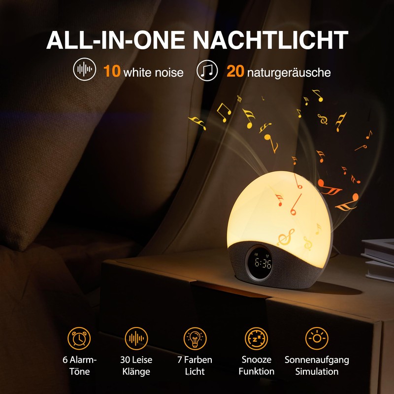 - 7 light colours and 6 alarm tones – adjust the night light individually, with 7 different colours and 6 alarm tones that provide a relaxed atmosphere and a pleasant alarm experience.
