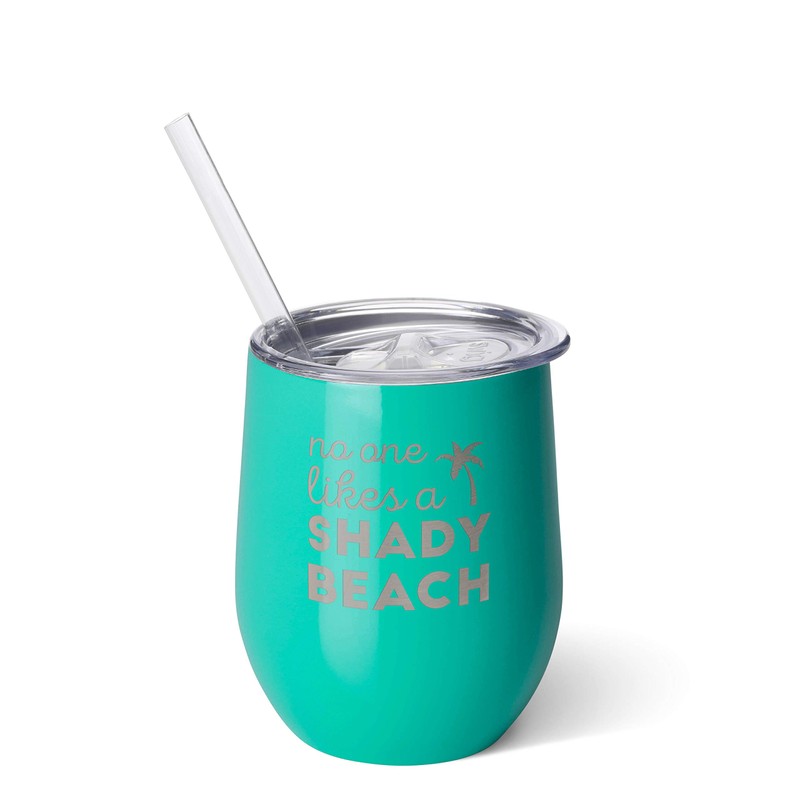 Swig Life Stainless Steel Insulated 12oz Stemless Wine Cup with Slider Lid and Straw - No One Likes a Shady Beach (Turquoise)