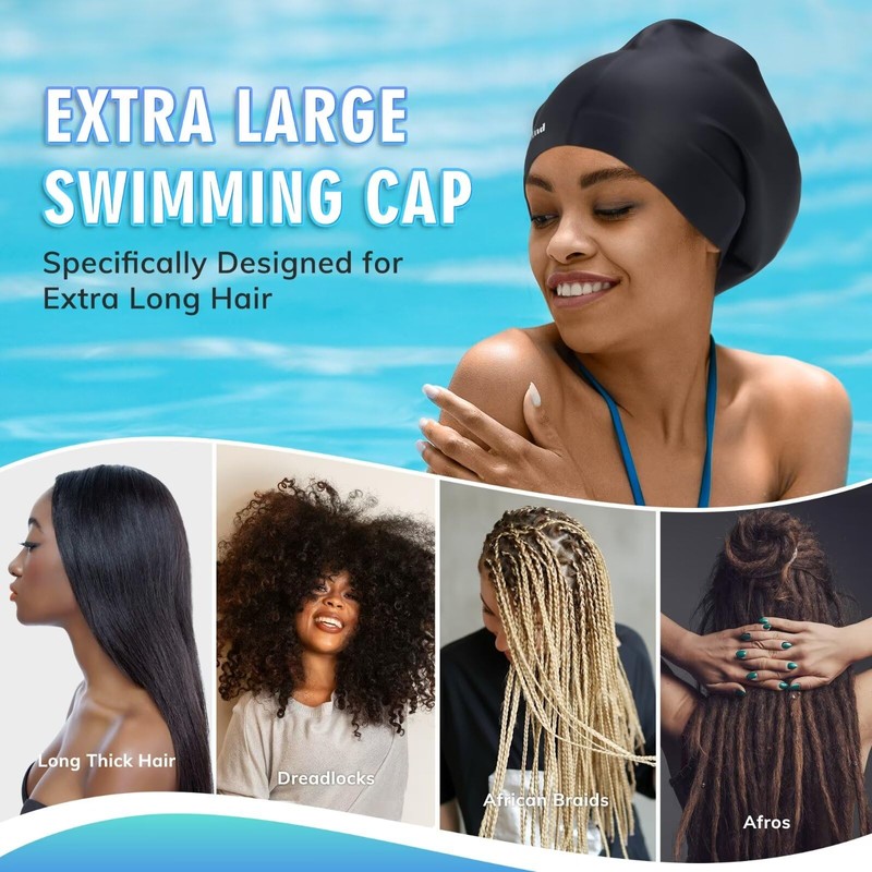 - 【Extra Large for Bulky Hairstyle】: The swim cap is specifically designed with extra large size for spacious room, so that it has enough room to fit large head and any bulky hairstyle: Curly Hair, Extra Long Hair, Braids, Dreadlocks, Crochet Mambo, Locs, Extensions, Weave on, Afro hair. It would keep your hair lock secure and tangle-free when swimming, have a comfortable swimming time.