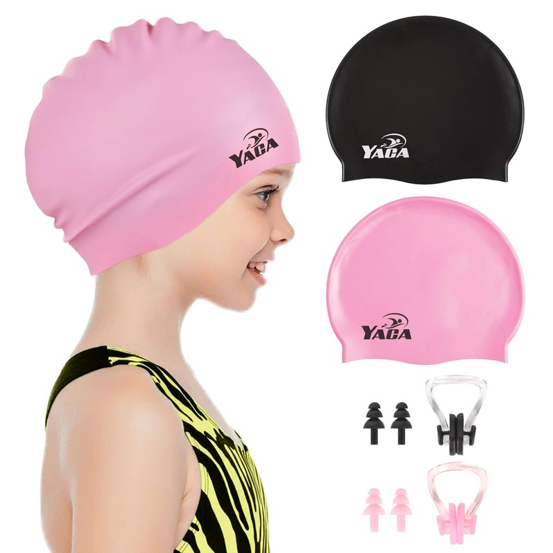Swim Cap Kids for Long Hair, 2 Pack Silicone Swimming Cap for Boys Girls Aged 3-15, Durable Kids Swim Cap Short Hair, Fit Waterproof Swim Caps for Kids Toddler, with Ear Plugs & Nose Clip