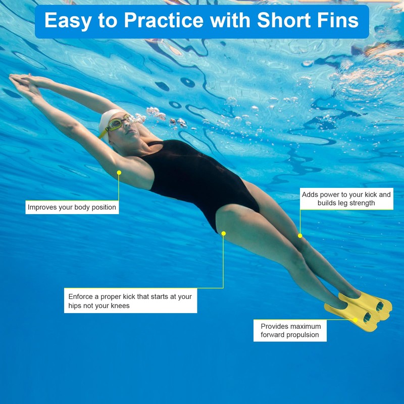 - 🏊🏼♂️BUILD LEG STRENGTH AND ANKLE FLEXIBILITY: The short blade design of the training fins can promote shorter and faster kicks to improve technique and enhance leg strength, increases flexibility and range of motion for a more efficient kick.