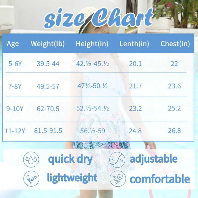 - Size Range:One-piece swimsuit with dress, suitable for girls aged 5-12. Made from 82% nylon and 18% spandex, a quick-dry, lightweight, breathable, stretch fabric.