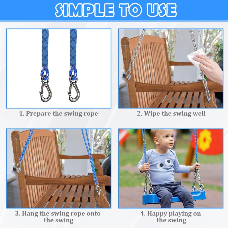 - EASY INSTALLATION You don't need any other hardware. First throw it over a tree or beam and attach the hooks to your swing or patio furniture. Secondly, open the safety clasp, pass the rope through the metal buckle and then lock it firmly until the rope is pulled.