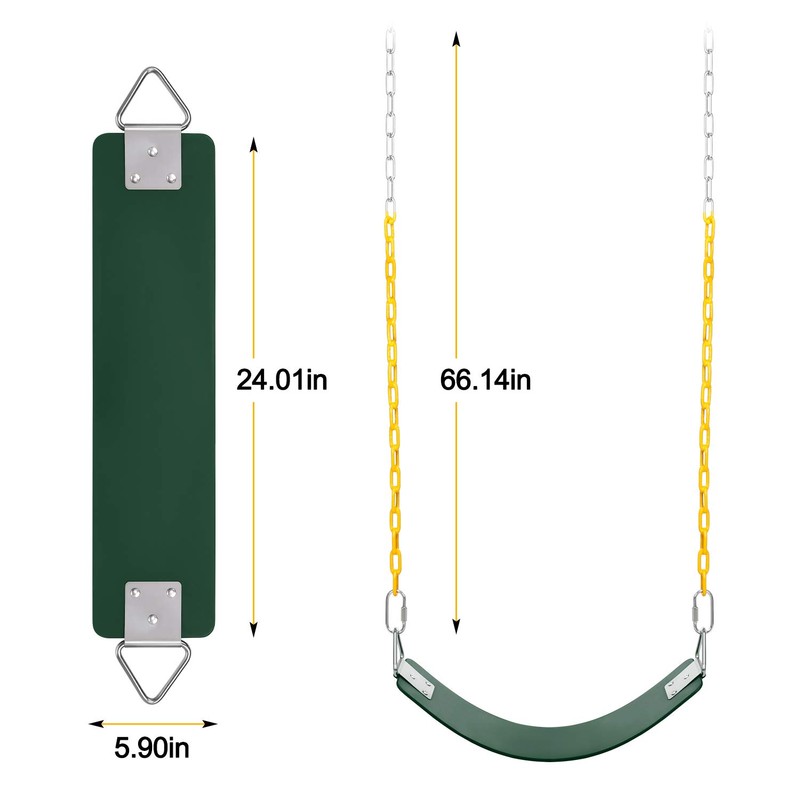 The size of swing seat is 24 * 5.9 inches. The EVA plastic is proved to be soft, thickened and tough, which makes you feel comfortable while sitting on the swing seat. It is possessed of a ton of excellent performances, such as corrosion resistance, crack resistance and chemical resistance.