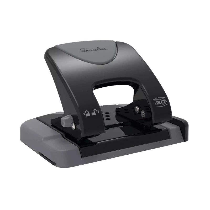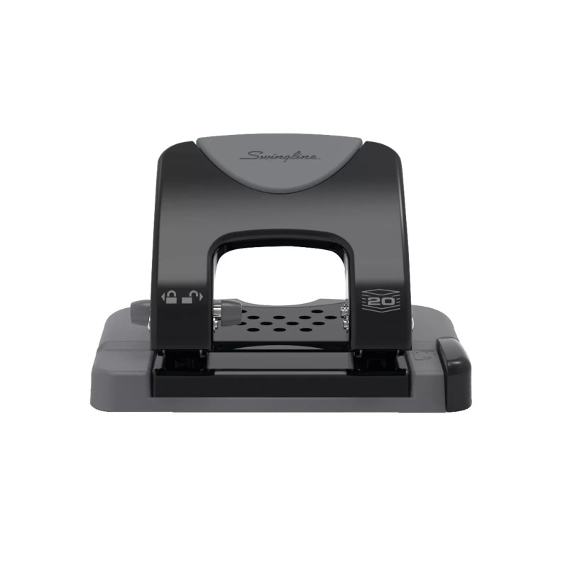 The Swingline SmartTouch 2-Hole Punch is a strong choice for consistent hole punching, with metal construction, fixed punch heads and an edge guide for precise punch alignment. The wide, comfortable, soft grip handle makes it easier to punch and locks in closed position for easy storage. Low force punch requires 50% less effort to operate than standard punches, and cuts through paper with minimal effort on the part of the user. Pierces through up to 20 sheets of paper, cutting clean 9/32” holes. Cleanup of punched holes is simple with a convenient opening built into the base. The hole pattern in the base allows the user to see when the chip tray is full..