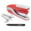 Quick Touch stapler offers powerful performance for effortless stapling that is Jam Free Guaranteed. This stapler uses a stored energy system that provides a boost of power to eliminate the need to push harder as sheet counts increase. Stapling 2 sheets or 28 sheets is equally easy. This full size, full strip stapler also features Quick Load to make refilling easier. With a push of the red button on top, the magazine ejects from the front of the stapler. Durable metal construction delivers long-lasting stapling performance and steps up the style with shiny silver accents. With a reduced effort, ergonomic design and non-slip base this model makes desktop stapling a breeze. 28 sheet stapling capacity. Jam Free Guaranteed when used with Swingline S.F. 4 Premium Staples. Red/Silver. Limited 5 year warranty.