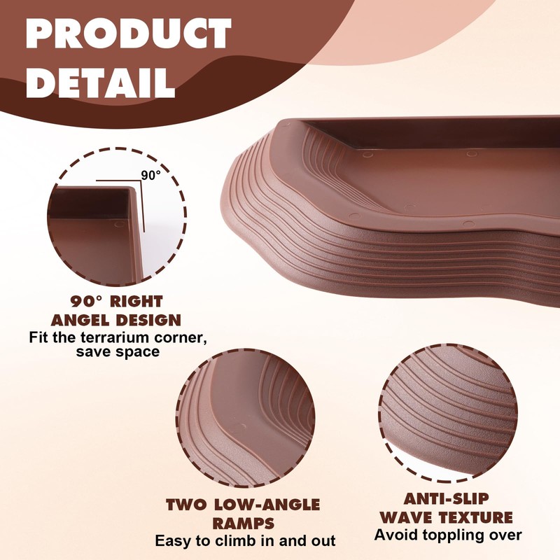 - Double Ramp Design: Tortoise food dish includes dual low-angle ramps for easy to climb in and out, while the anti-slip wave textured surfaces on both sides prevent pets from slipping or falling.