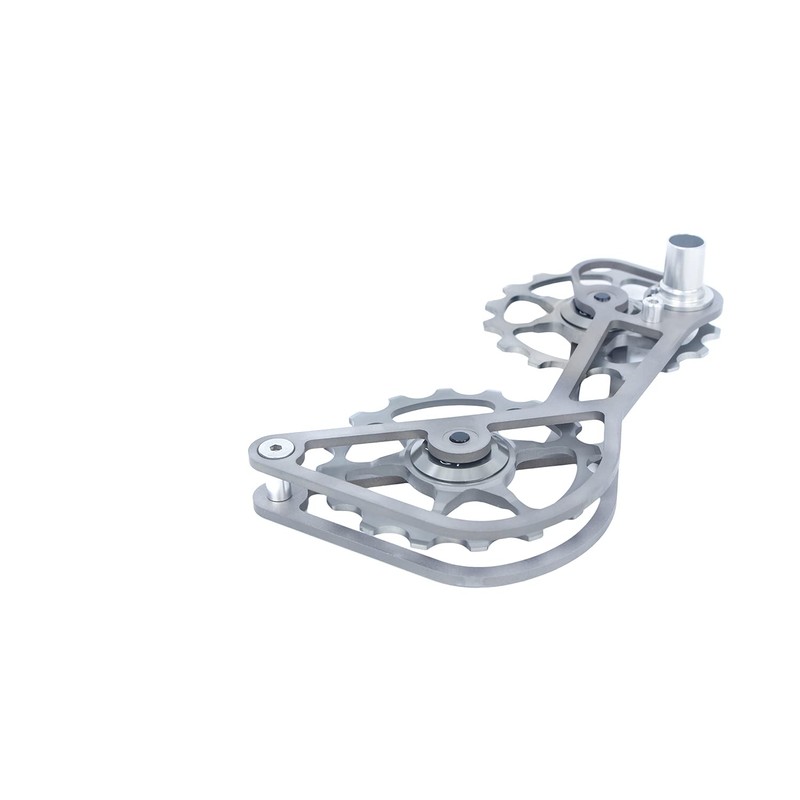 The system consists of Top 14t & Bottom 16t alloy pulley wheels fitted with low friction bearings and a lightweight strong cage made from Titanium material.
