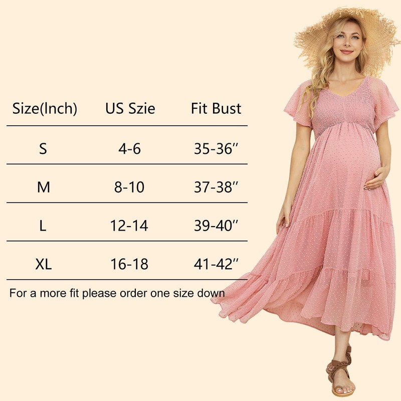 - [Elegant& Stylish] We can't help but fall in love with how elegant the Boho Swiss Dot Smocked Tiered Maternity Maxi Dress is! Swiss dots and flattering flounce hem adds femme and elegance to this breezy, woven dress with a V neckline, smocked bodice, and short ruffle loose sleeves.