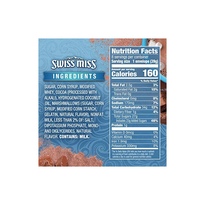 Swiss Miss Chocolate Hot Cocoa Mix With Marshmallows makes a warm, delightful hot cocoa drink with mini marshmallows. This hot cocoa drink mix easily transforms into a rich, creamy hot cocoa with marshmallows. Swiss Miss Hot Cocoa Mix is packaged in individual packets so every mug you make is equally delicious. You won't miss your old hot chocolate with marshmallows. This chocolate hot cocoa powder is made with real cocoa and nonfat milk. Not only is this a gluten free hot cocoa mix, but it's made with no artificial sweeteners, preservatives, flavors or colors. Preparing a delicious mug of this hot cocoa is easy. Empty the chocolatey cocoa mix into a mug, add 8 ounces of hot water (or milk for a richer taste) and stir. Enjoy a mug as part of your morning routine, on chilly days or as a sweet evening treat. Whatever you're warming up to, know that Swiss Miss will give you everything you need in the palm of your hands.