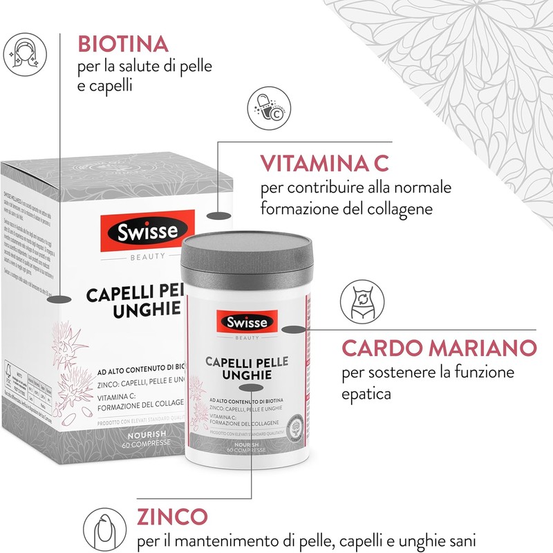 - INTEGRATORE 3 IN 1 PER CAPELLI, PELLE E UNGHIE: Swisse Capelli Pelle Unghie è un integratore di biotina, zinco e vitamina C con formulazione multi-nutriente per un supporto nutrizionale che agisce dall’interno, adatto sia per uomini che per donne. È l'ideale per mantenere capelli, pelle e unghie sani