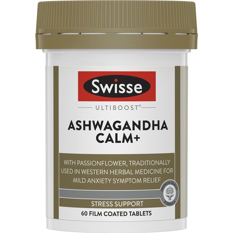 Discover the calming power of Swisse Ultiboost Ashwagandha Calm+. Containing a unique blend of ashwagandha, passionflower, and reishi mushroom as well as magnesium which supports nervous system health and a healthy stress response in the body. Vegan-friendly, it's a calming alternative to support a stressful lifestyle.