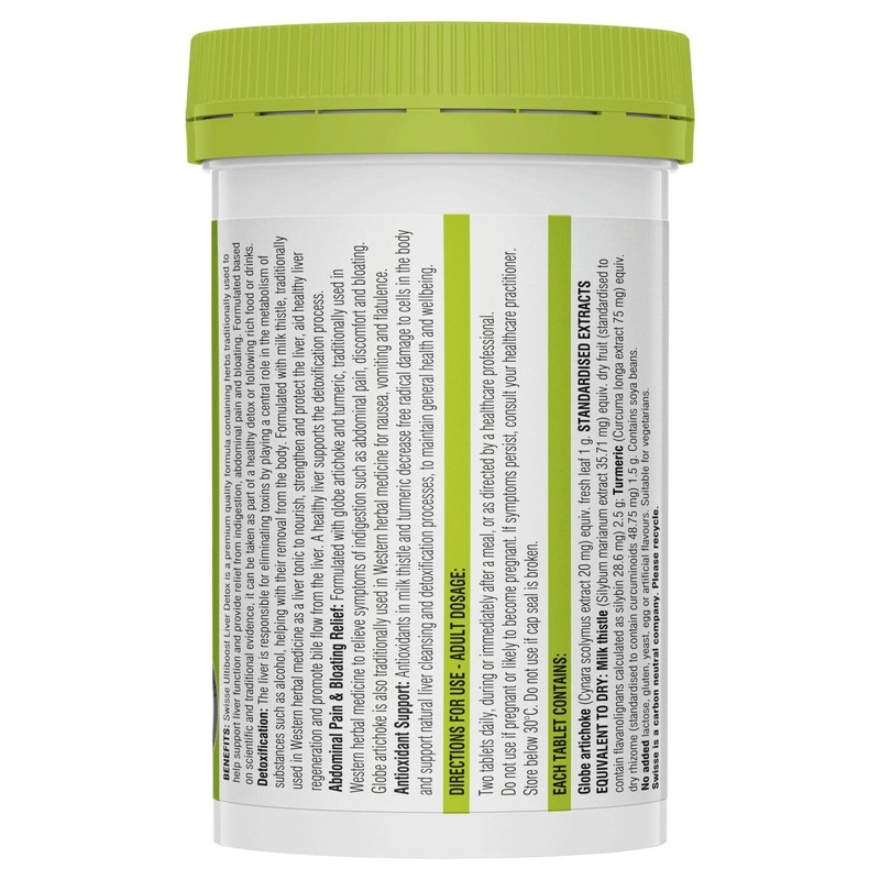 - Swisse Ultiboost Liver Detox is formuled to help support liver health & detoxification and digestion. Swisse Ultiboost Liver Detox also contains ingredients also help relieve indigestion and bloating. Key Benefits: - Supports liver health and function - Healthy liver supports the detoxification process - Help relieves indigestion, flatulence, abdominal bloating and cramping - Antioxidant Support - Contains quality formula herbs Swisse Ultiboost Liver Detox has been