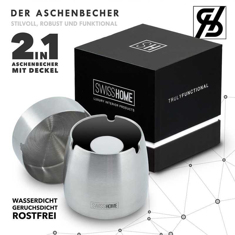 - [Perfect size] With a height of 7.5 cm and a width of 7.8 cm, this stand ashtray is not too big and fits well into any interior without dominating ashtray. Its capacity is more than sufficient to convince also at parties inside and outside, with many smokers, by sufficient capacity. Other ashtrays look bulky and immediately stand out. Not the SwissHome ashtray. It is also lockable.